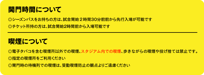 試合や会場によって変動もあるが、概ね2時間30分前にシーズンパスの先行入場が、2時間前に一般来場者の入場が開始される。一旦入場したあと、再びグルメガーデンやグッズ売り場に行くのももちろんOK。再入場に必要となるのでチケット利用時は半券は取っておこう。