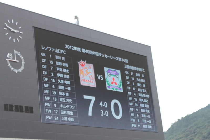 レノファ山口FC 三菱自動車水島FC 4 前半 0 3 後半 0 6分 ♯17 田村(♯23 中山) 34分 ♯9 キム(♯6 原田) 37分 ♯9 キム(♯10 福原) 39分 ♯19 坂本 65分 ♯10 福原(♯17 田村) 73分 ♯24 上垣(♯9 キム) 90+1分 ♯19 坂本 得点