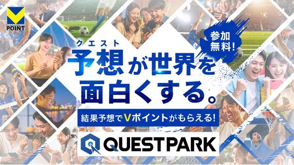 「QUESTPARK」は、スコアやシュート数、活躍選手など10項目のうち3つを選択して予想し、的中させるとVポイントがもらえる参加型の試合予想体験です。予想がすべて的中した応募者全員で、毎試合Vポイント10,000~30,000ポイントを山分けする仕組みとなっています。参加無料かつ試合開始60分後まで参加可能なため、前半の流れを見た上でハーフタイムに予想を変更することもでき、臨場感のある観戦体験が可能となっています。