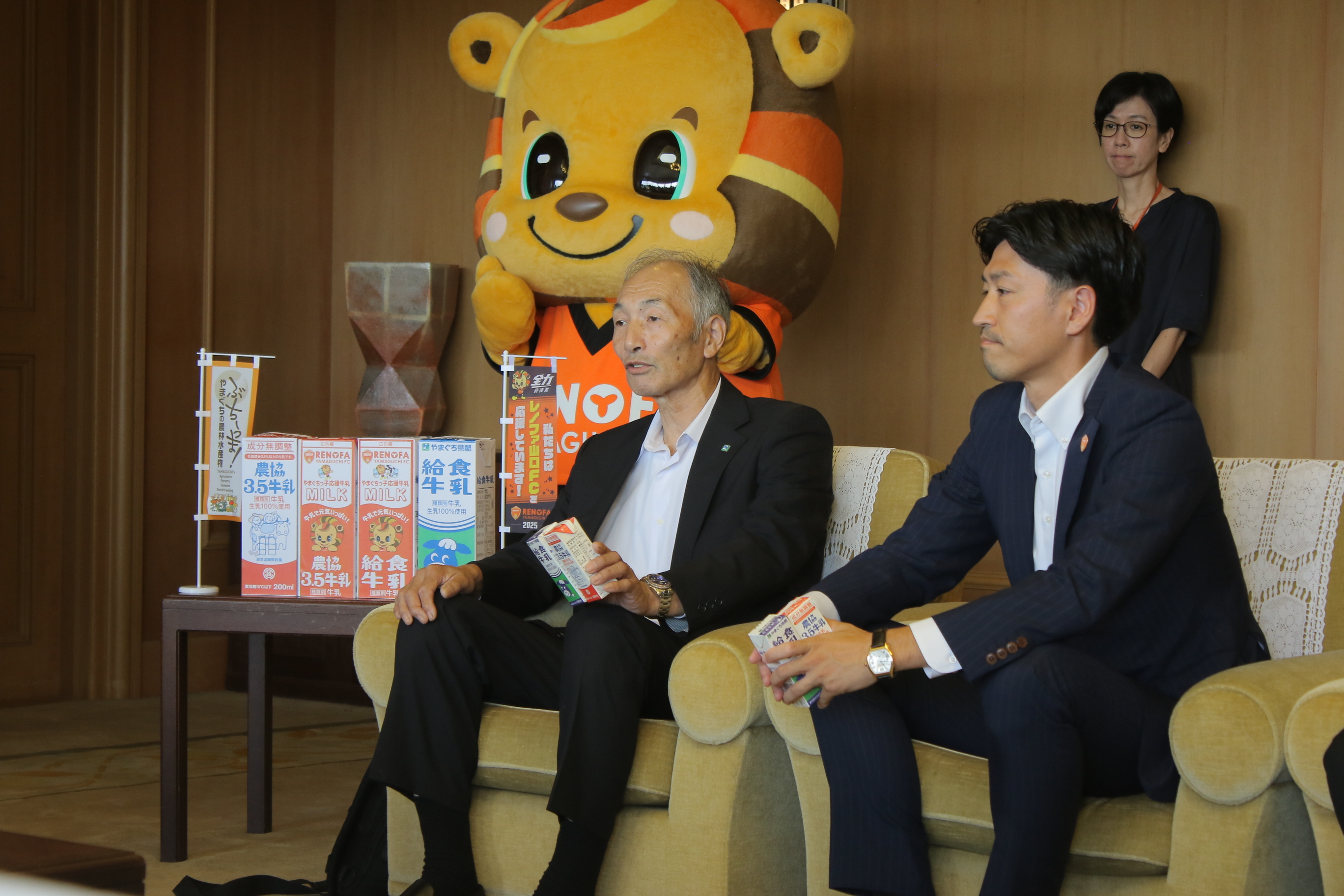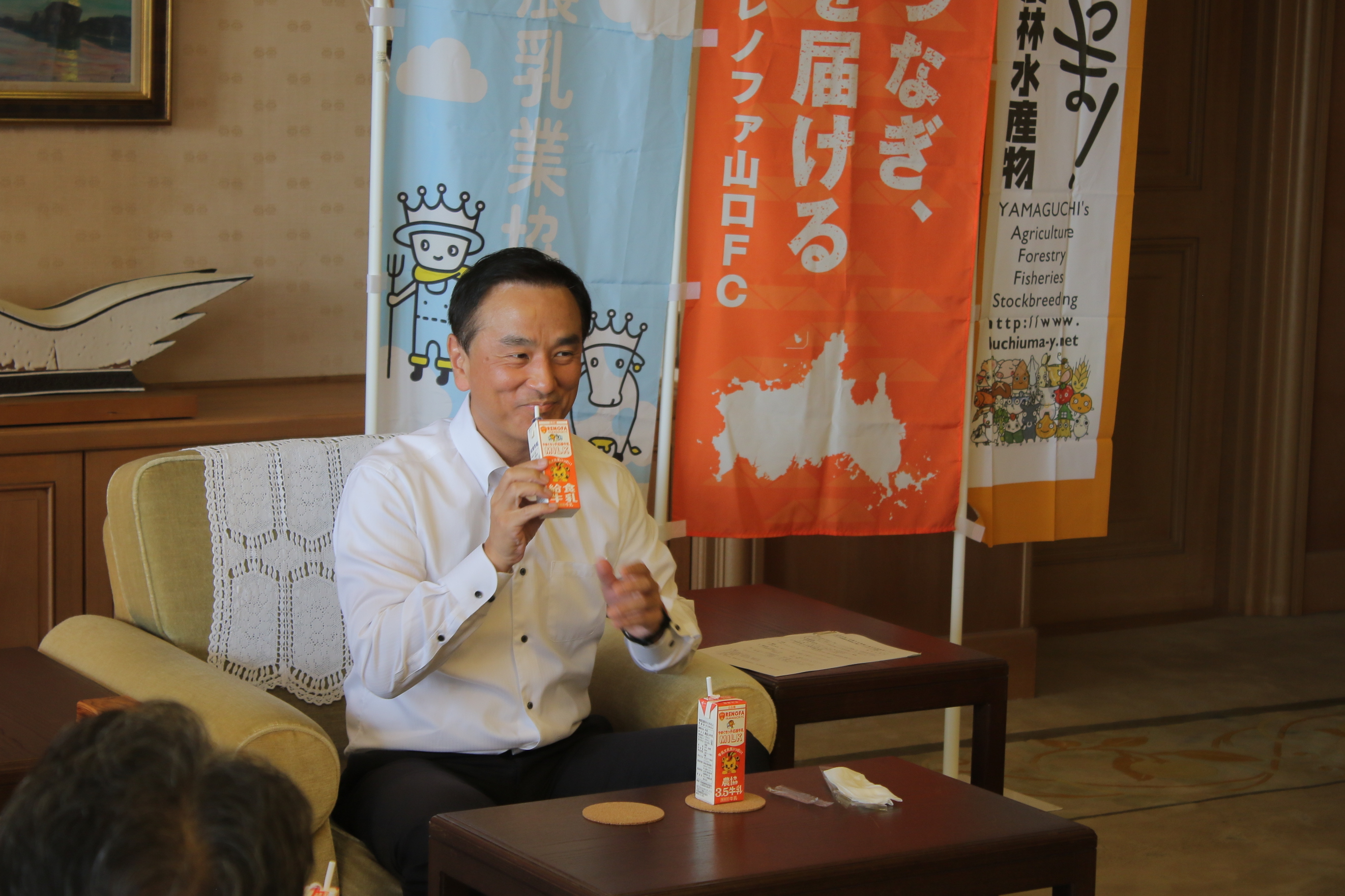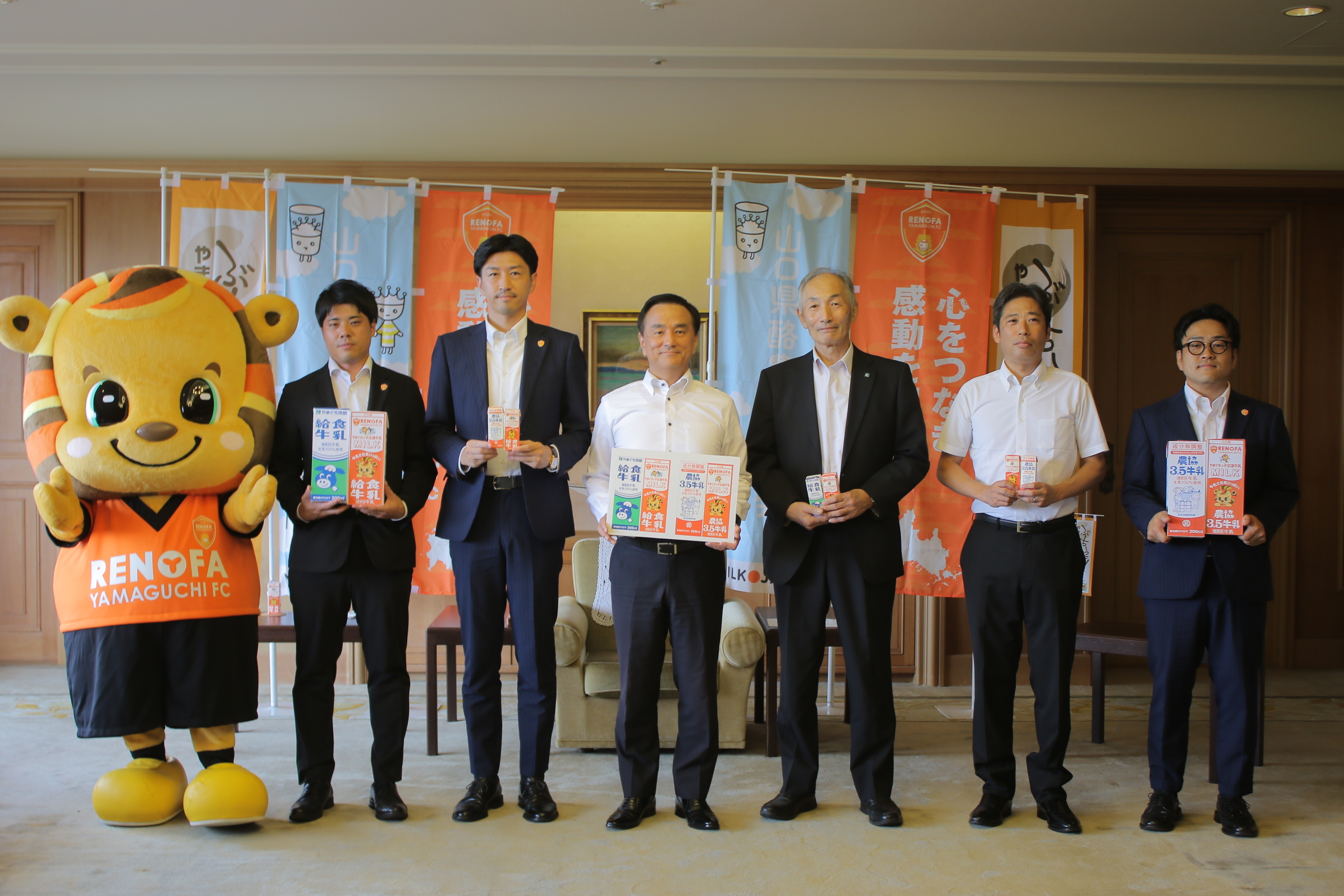 8/18(月)、レノファ山口FC渡部社長が山口県酪農乳業協会の原田会長とともに、村岡県知事を表敬訪問し、「学校給食用牛乳」の新たな取り組みに係る報告をいたしました。
