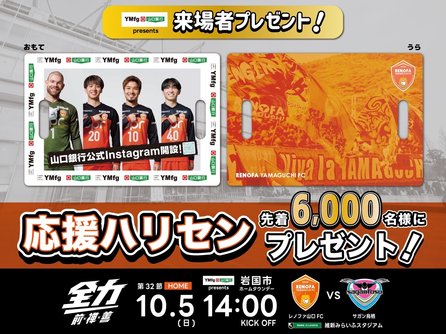 山口銀行様のInstagramアカウントのQRが入った応援ハリセンを各入場ゲートにて配布します(アウェイゲート除く)!選手入場時には裏面のレノファのオレンジを掲げて熱き応援をお願いします。