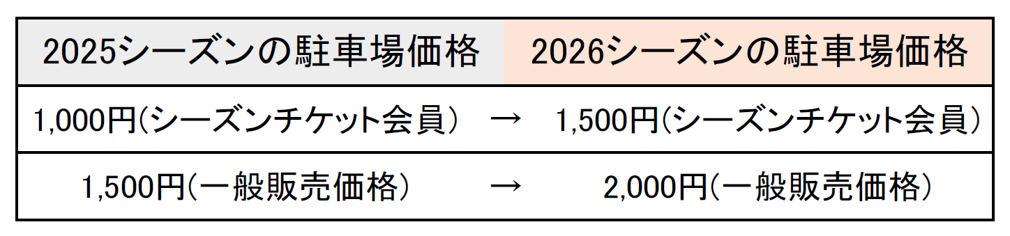昨今の社会情勢や物価上昇、人件費の高騰等を理由として、明治安田J2・J3百年構想リーグより駐車場価格の価格改定をすることとなりました。皆さまにご負担をお願いすることは大変心苦しい限りですが、何卒ご理解と変わらぬご支援を賜りますようお願い申し上げます。