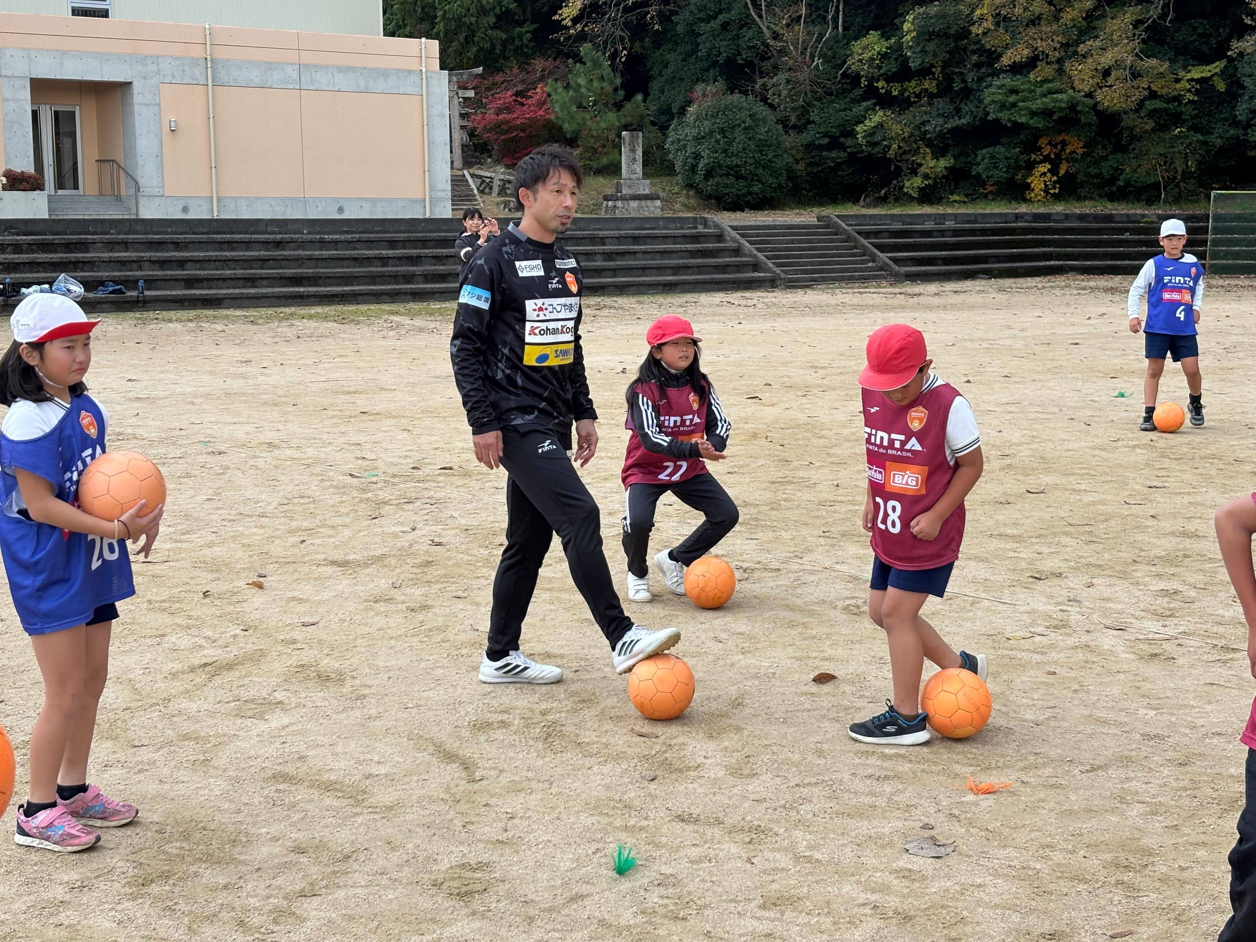 前半のサッカー教室では児童たちとボールを使った運動を行い、ロングキックの実技披露などを行いました。