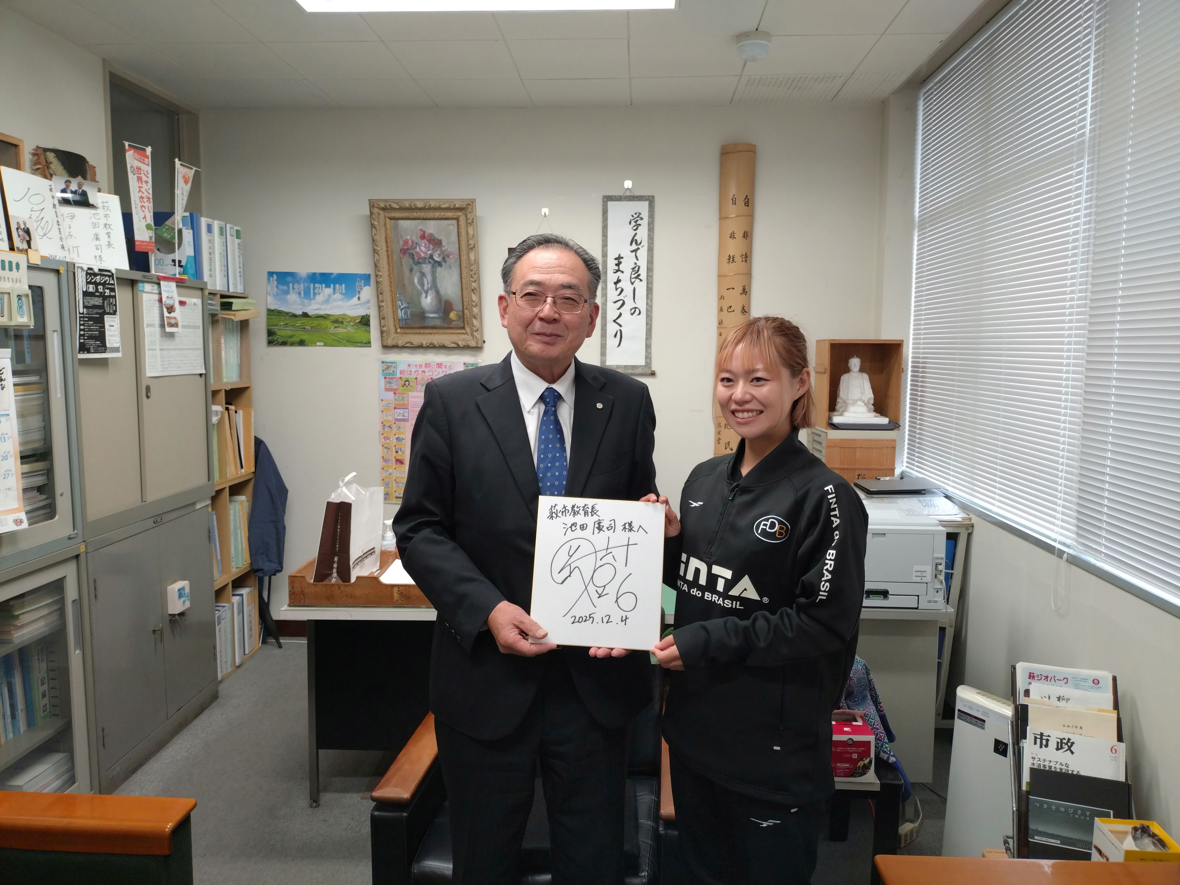 さらに、萩市教育委員会の池田教育長と面会し、激励の言葉をいただきました。