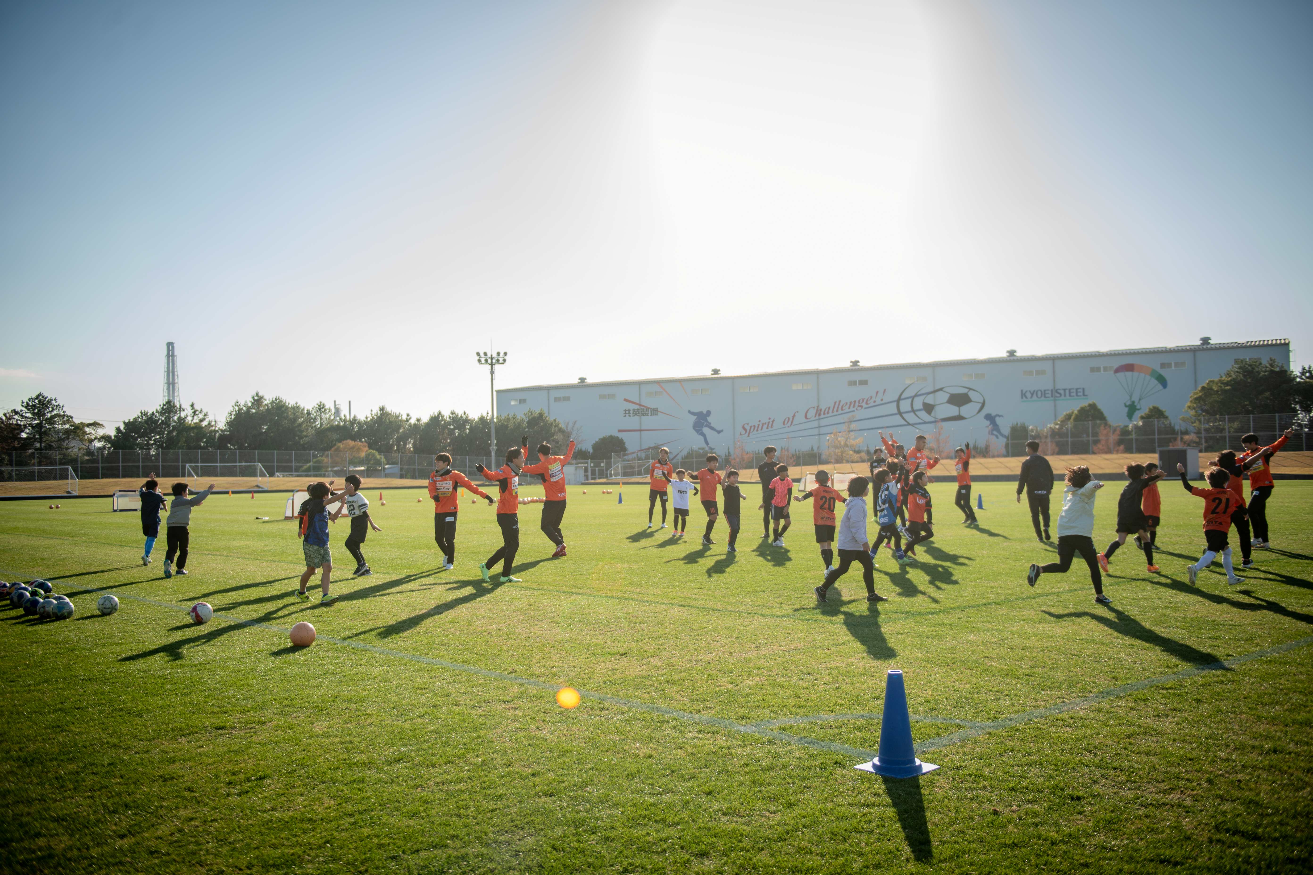 普段は選手が練習をしている天然芝に子どもたちも大興奮! 実際にプロの選手とも触れ合えるサッカー教室でご参加いただいたお子様や保護者の皆様には大変喜んでいただけました。
