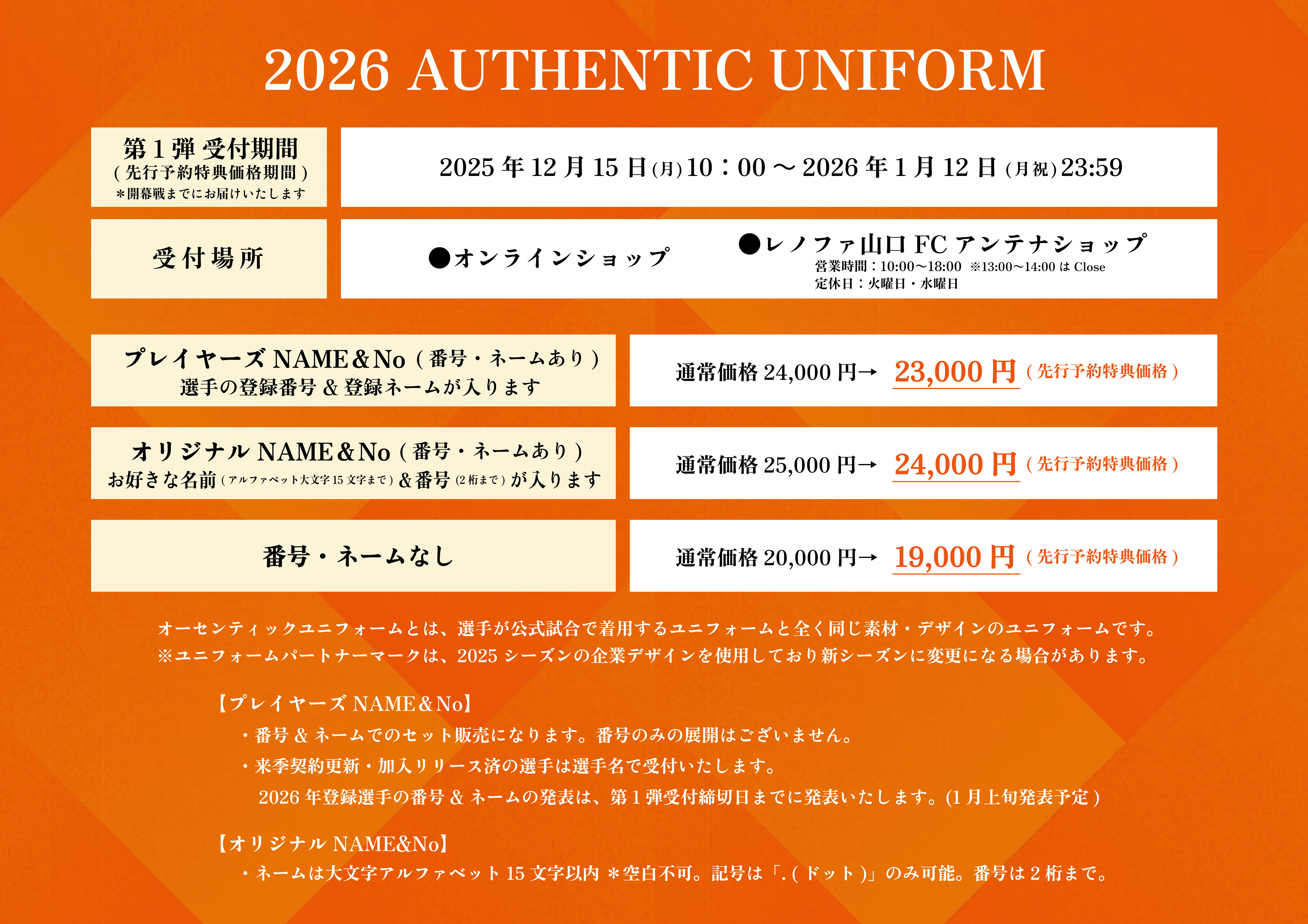 このたび、レノファ山口FCの明治安田J2・J3百年構想リーグで着用するユニフォームデザイン、販売概要が決定しましたのでお知らせいたします。