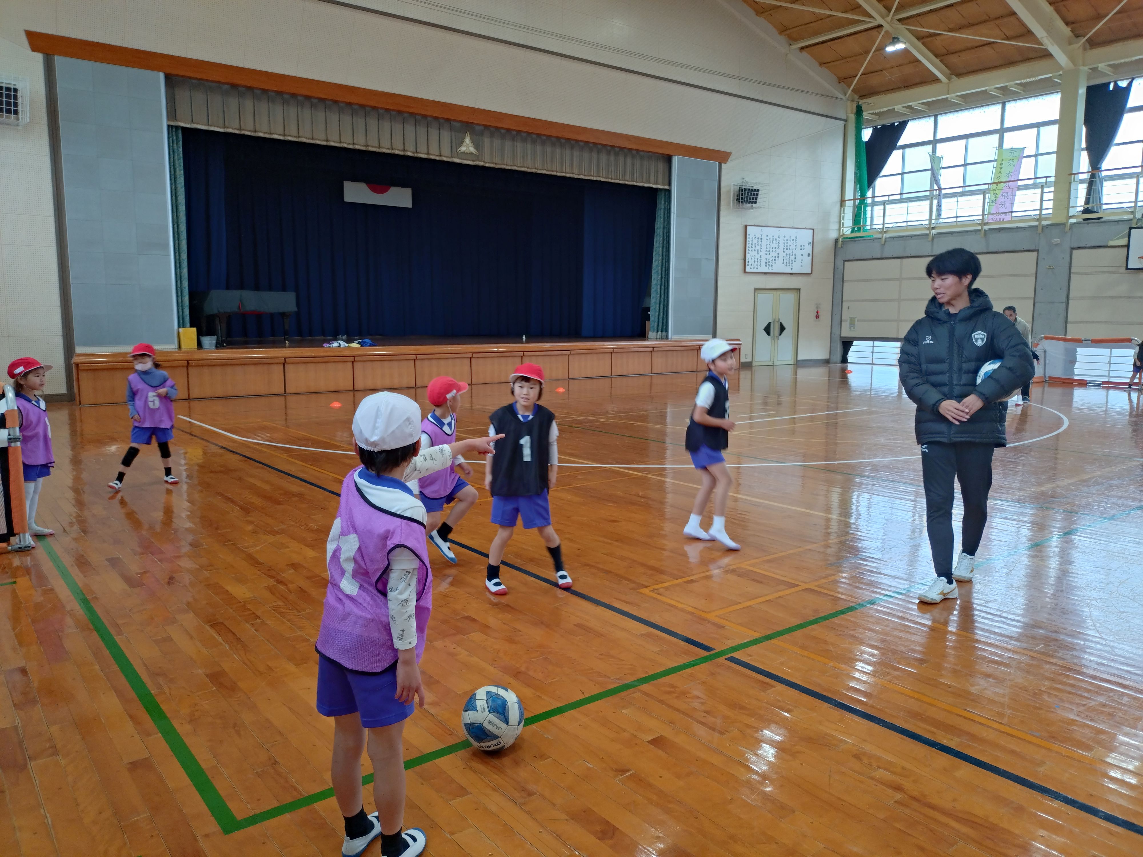 サッカーボール等を使った「体つくりの運動あそび」等を通じて、児童の皆さんに、日常的に運動することの大切さや運動の楽しさを伝えました。