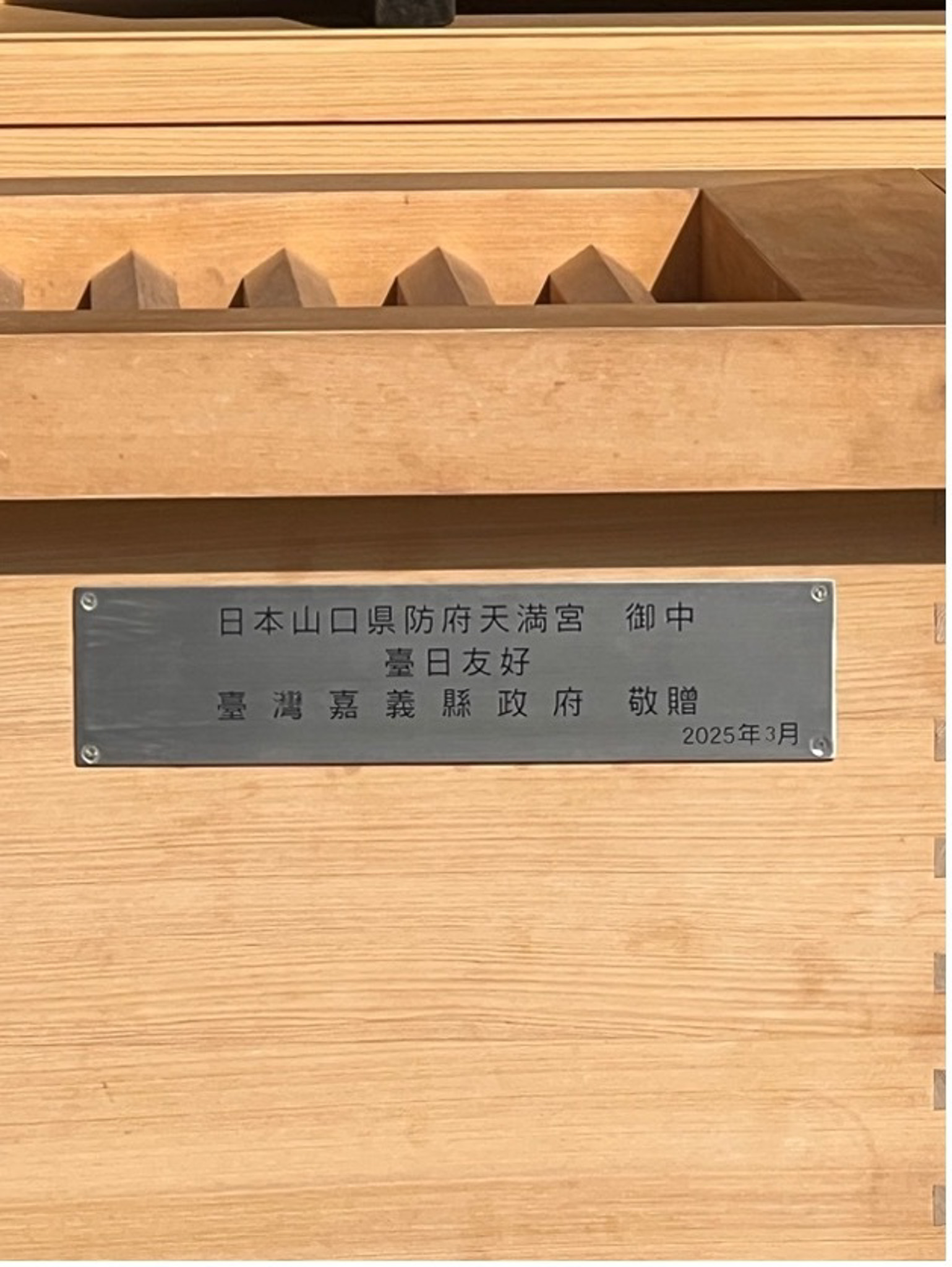 防府市役所庁舎8階展望回廊では防府市・台湾との歴史・文化のつながりとして、日台友好促進山口県議会議員連盟 島田教明会長様より、防府市出身第11代台湾総督・上山満之進(かみやまみつのしん)が台湾の画家・陳澄波(チェンチェンポー)に依頼した油絵「東台湾臨海道路」について説明を受けました。その後、防府天満宮では台湾・嘉義県にて製作され奉納された「台湾産檜賽銭箱」や神社参拝における礼儀作法などを体験しました。