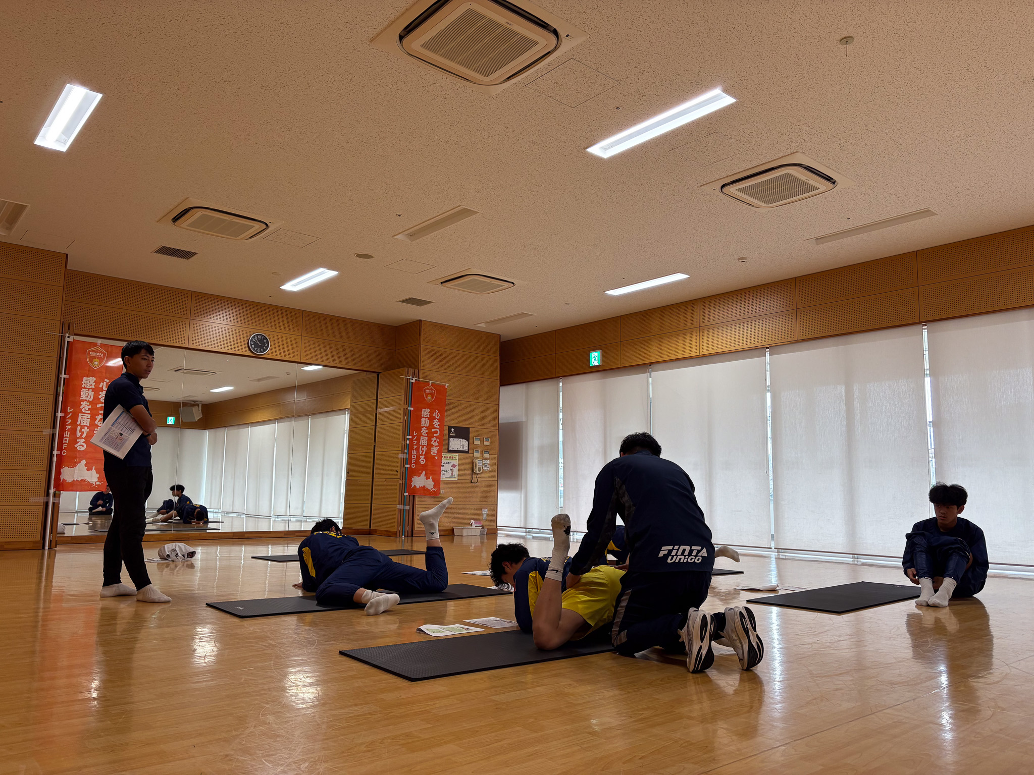 レノファ山口FCアカデミーの平本コーチより、けがを防ぐ正しいストレッチやウォーミングアップ、体幹トレーニングの重要性を講義実習しました。