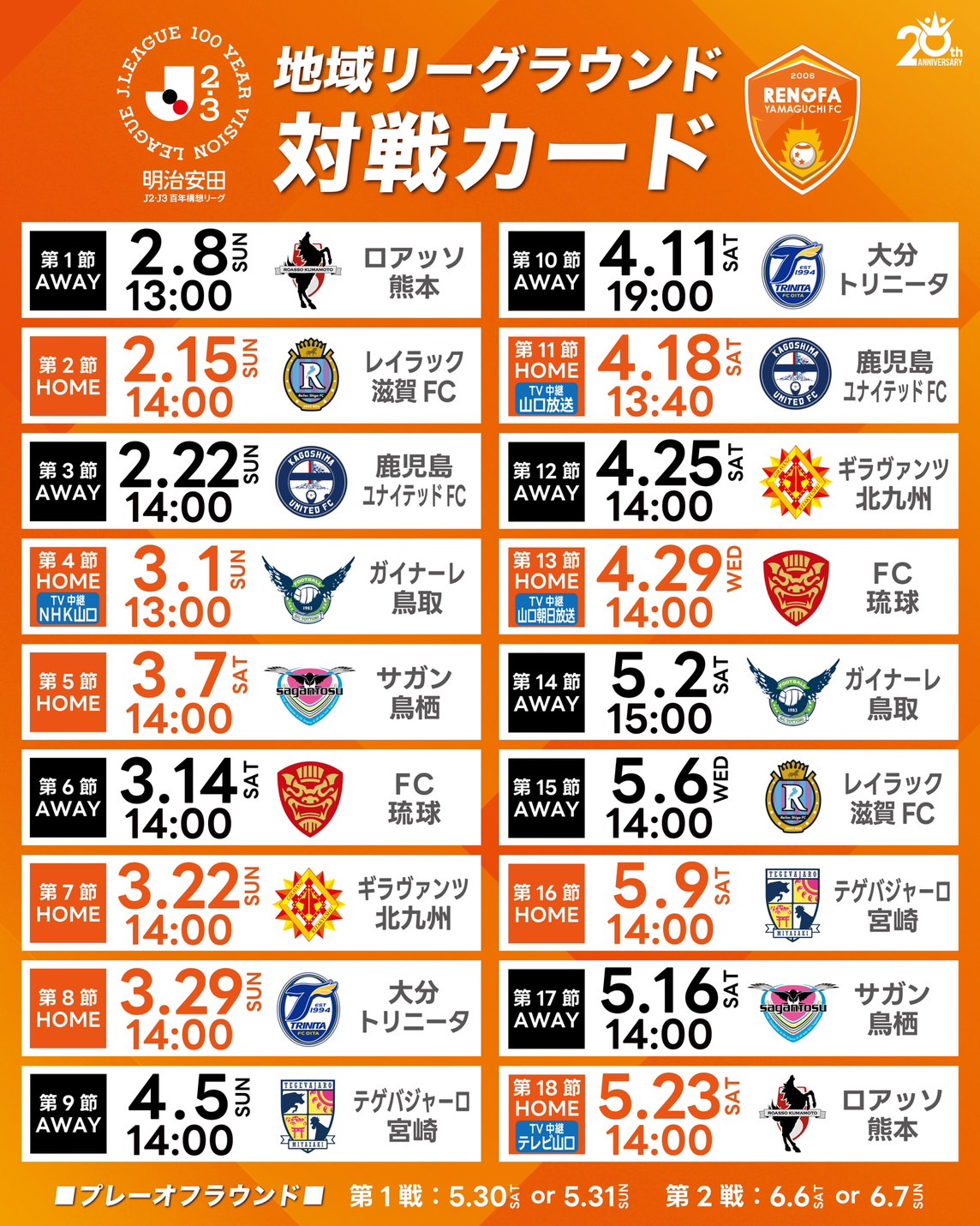 2026年2月から6月まで開催する明治安田Jリーグ百年構想リーグについて、地域リーグラウンドの試合日時が決定しましたので、お知らせいたします。