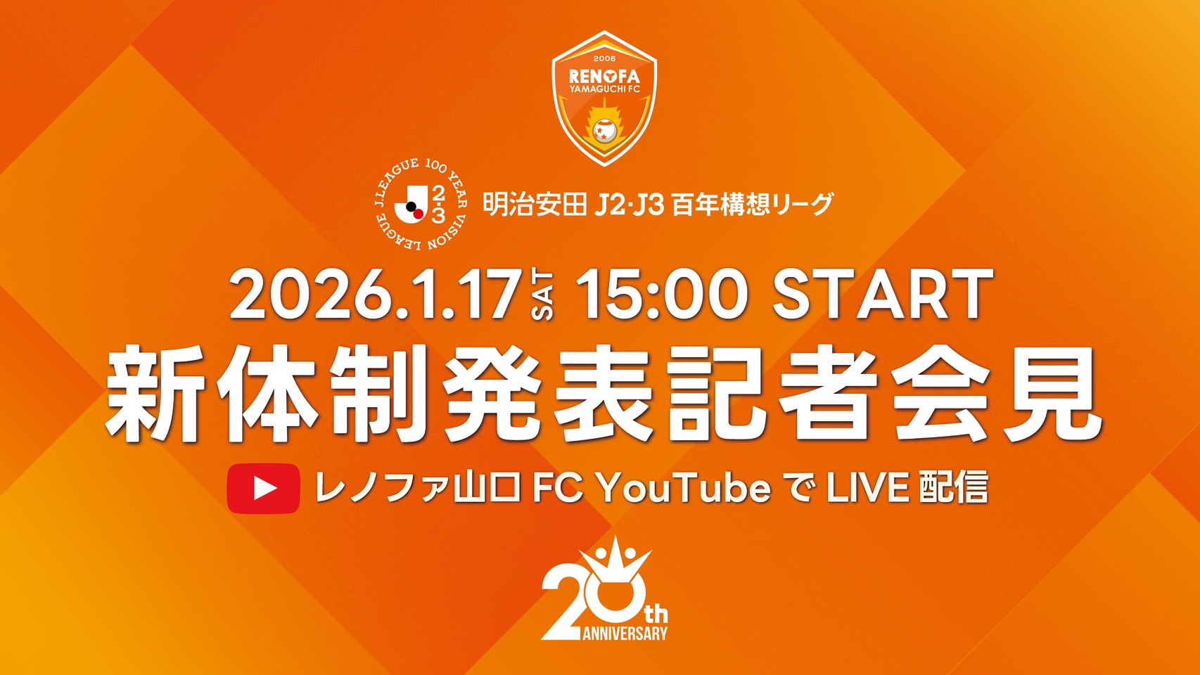 2026年1月17日(土)に開催する「明治安田J2・J3百年構想リーグ レノファ山口FC新体制発表記者会見」をレノファ山口FC公式YouTubeチャンネルにてライブ配信いたしますのでお知らせいたします。