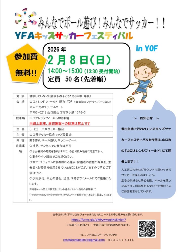 この度、YFAキッズサッカーフェスティバルを山口市・山口オレンジフィールドにて開催いたしますので、お知らせいたします。