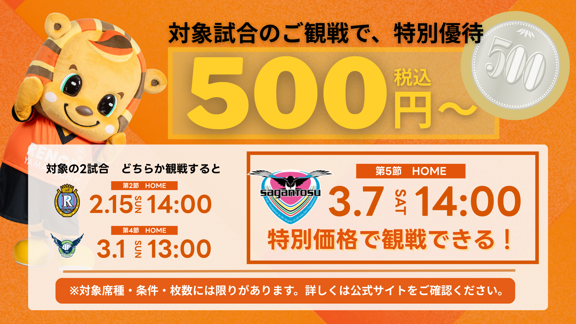 2/15(日)滋賀戦もしくは、3/1(日)鳥取戦にてご来場いただいた方全員に、3/7(土)鳥栖戦にてご利用いただける”500円~特別優待キャンペーン専用サイト”を記載したチラシを配布いたします。