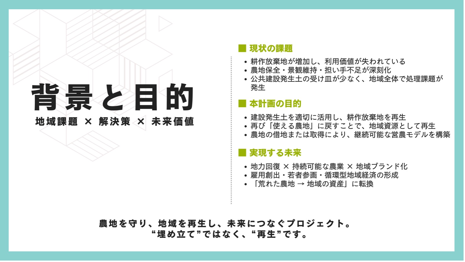 レノファ山口FCは「Jリーグで地方創生、まちづくり」を掲げ、地域とともに新たな価値を創出するクラブを目指しています。本活動は、耕作放棄地の増加や公共建設発生土の受け入れ先不足といった地域課題に向き合い、耕作放棄地を“今一度、人と自然が関わる場所”へと育て直し、環境・地域資源・人のつながりを未来へ手渡していく取り組みです。このような機会をいただき、クラブとして本取り組みに参加できたことに、心より感謝申し上げます。