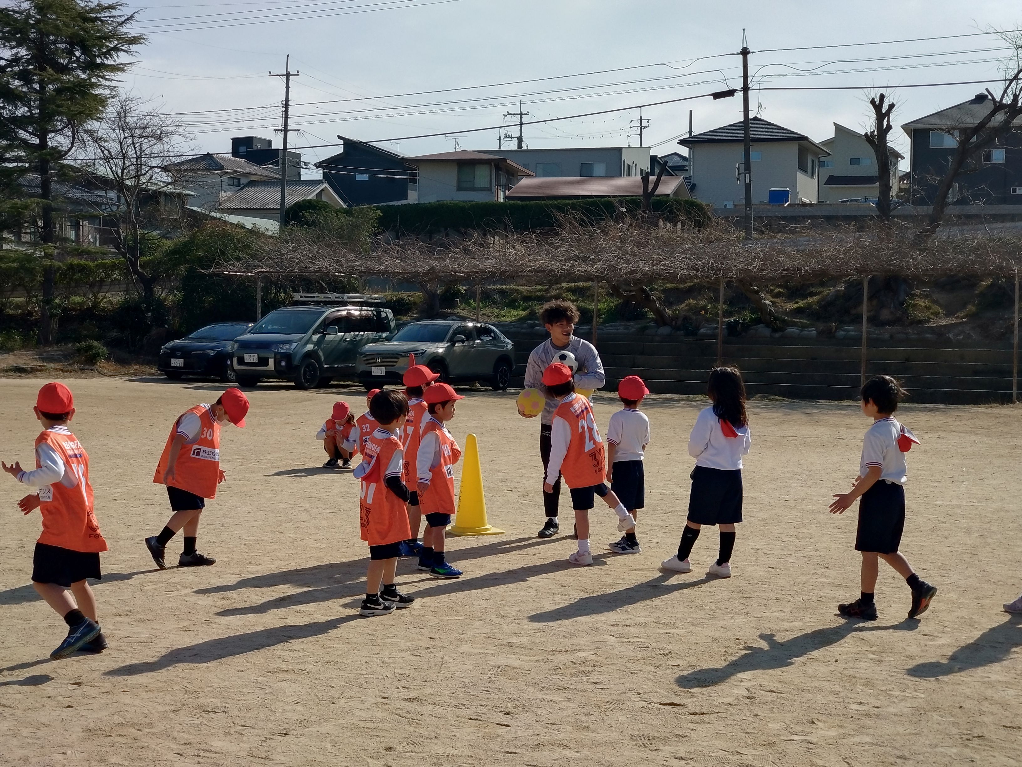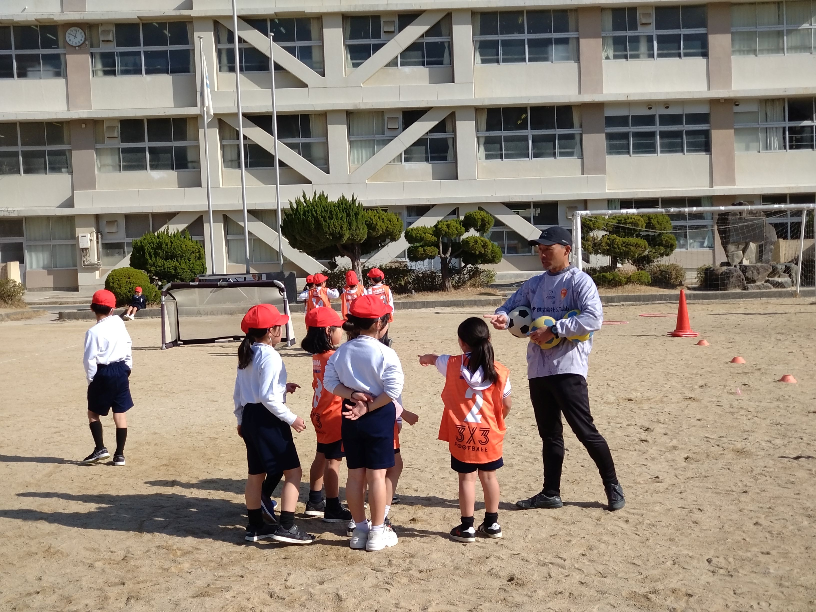 サッカーボール等を使った「体つくりの運動あそび」等を通じて、児童の皆さんに、日常的に運動することの大切さや運動の楽しさを伝えました。