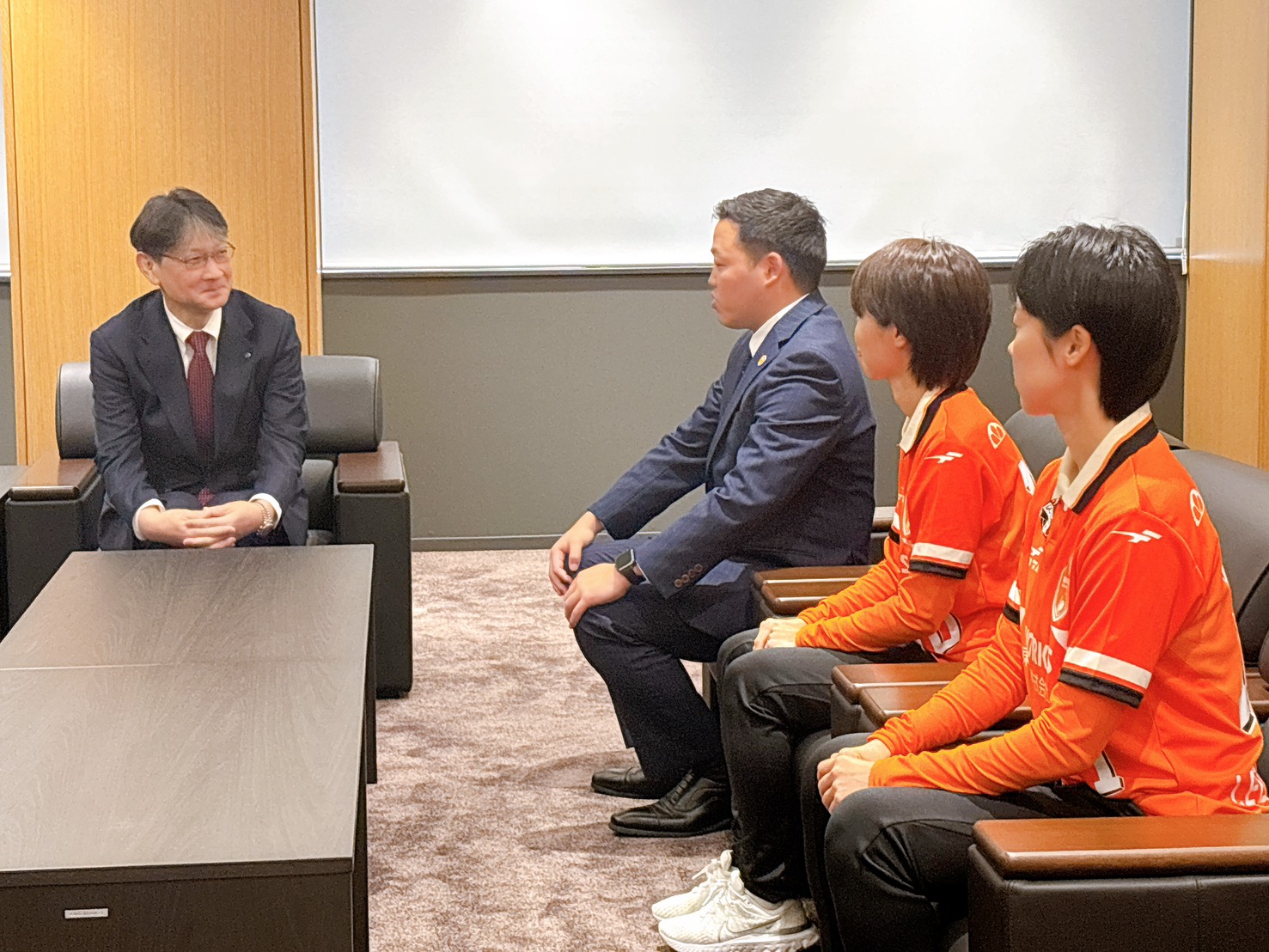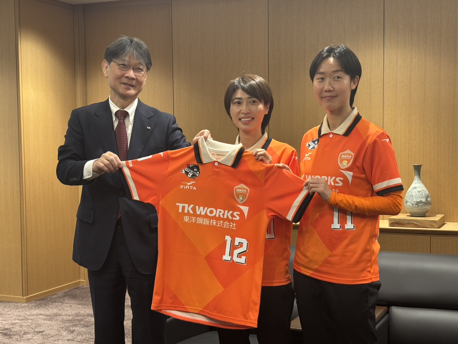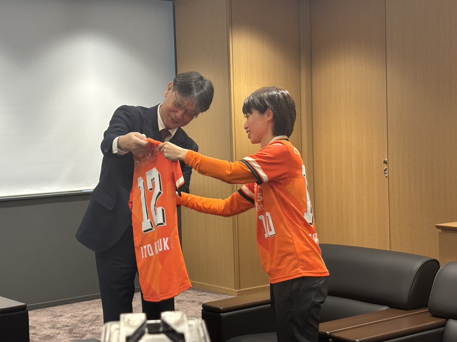 3月6日(金)、2026プレナスなでしこリーグ2部の開幕に向けて、赤嶺将太監督、田中陽子選手、イジョンウン選手が、伊藤和貴市長を表敬訪問いたしました。