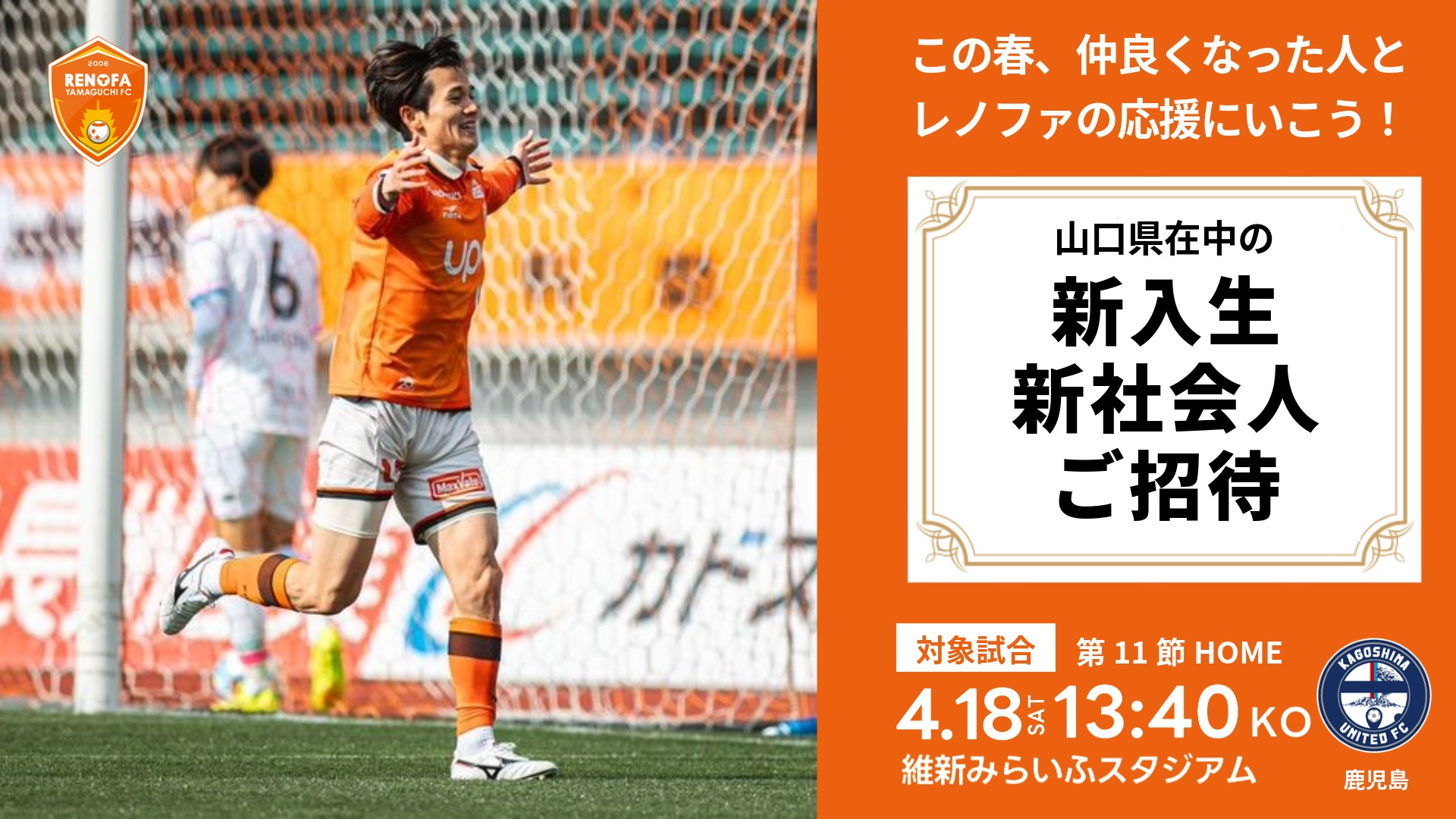 このたび、レノファ山口FCでは2026年4月にご入学する山口県内の「小学生、中学生、高校生、専門学生、大学生」・「ご入社する新社会人」をご招待することが決まりましたので、お知らせいたします。