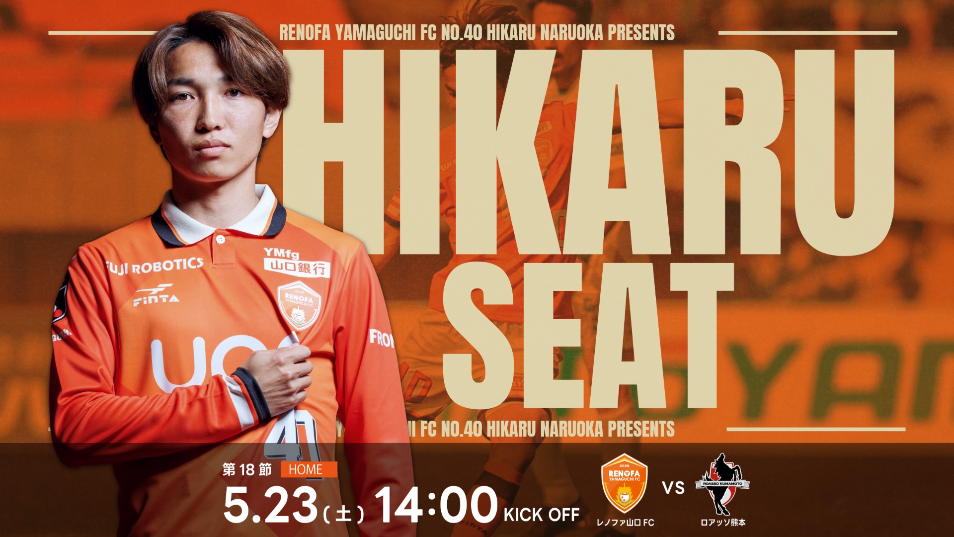 このたび、レノファ山口FC 成岡輝瑠選手が維新みらいふスタジアムで開催するホームゲームに皆さまをご招待する「HIKARU SEAT」企画を実施することになりましたのでお知らせいたします。