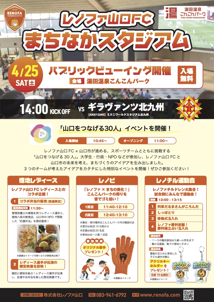 4月25日(土)に湯田温泉こんこんパークで「レノファ山口FCまちなかスタジアム」を開催します。