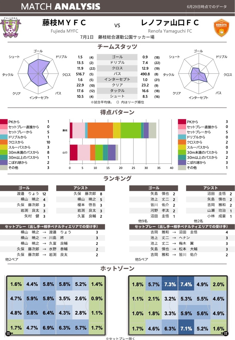 レノファが2-0で勝利した仙台戦の前半も、次のような数値になった。