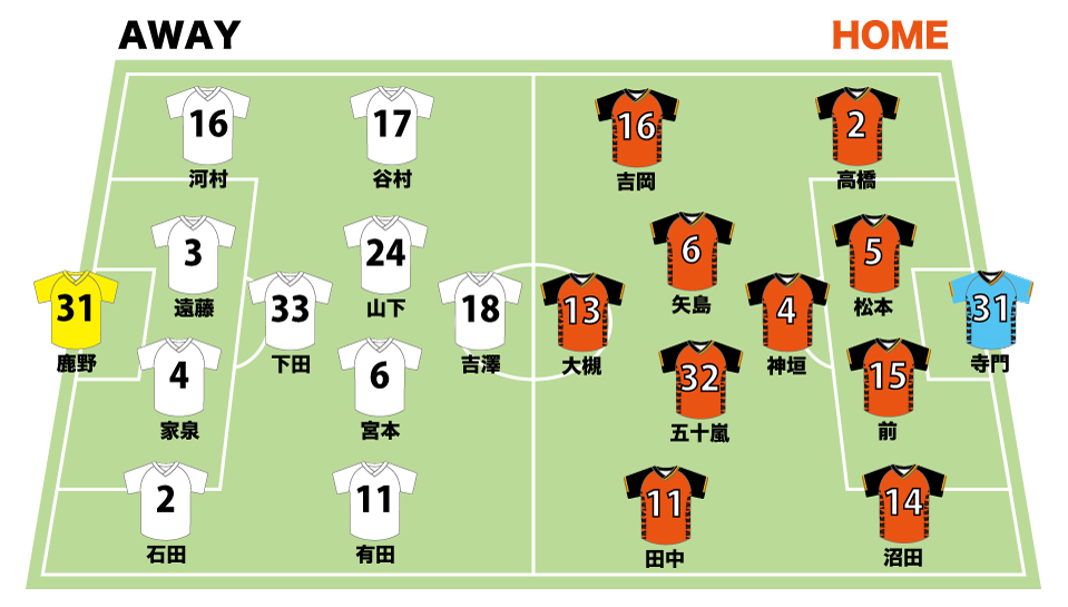 4試合連続でピッチに立っている41歳の33.山瀬功治と、5月に19歳になったばかりの下田栄祐。