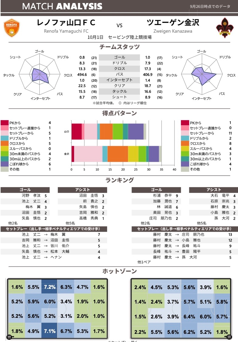 ツエーゲン金沢は悪天候で中断した第31節ザスパクサツ群馬戦の再開試合が9月27日に組まれ、約60分間というショートゲームをプレー。そこから中3日で今節を迎え、レノファとの対戦でイレギュラーな3連戦を締めくくる。