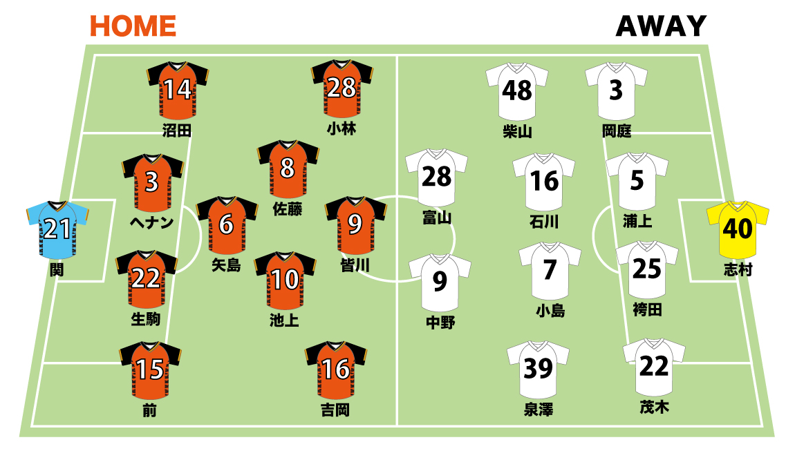 今日の昼過ぎにスタメンが発表されたあとは、選手たちがどのポジションでプレーするかに興味は移る。フォーメーションは図の通り、守備が4人、中盤が3人、前線が3人の4-3-3を想定しているが、名塚監督があっと驚くような采配を見せるかもしれない。皆川は頂点、生駒仁は守備陣の中央でプレーすると容易に想像できるが、複数のポジションで活躍できる選手も多く、サッカー好きを唸らせる起用もあるに違いない。