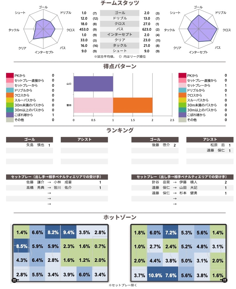 相手の磐田は開幕戦でファジアーノ岡山と対戦し、岡山攻撃陣にバイタルエリアで起点を作られる場面が見られた。岡山攻撃陣の動きが捕まえづらかったのも要因にあると思われるが、バイタルを隙と捉えれば、レノファ攻撃陣もこのエリアで積極的に勝負を仕掛けたい。