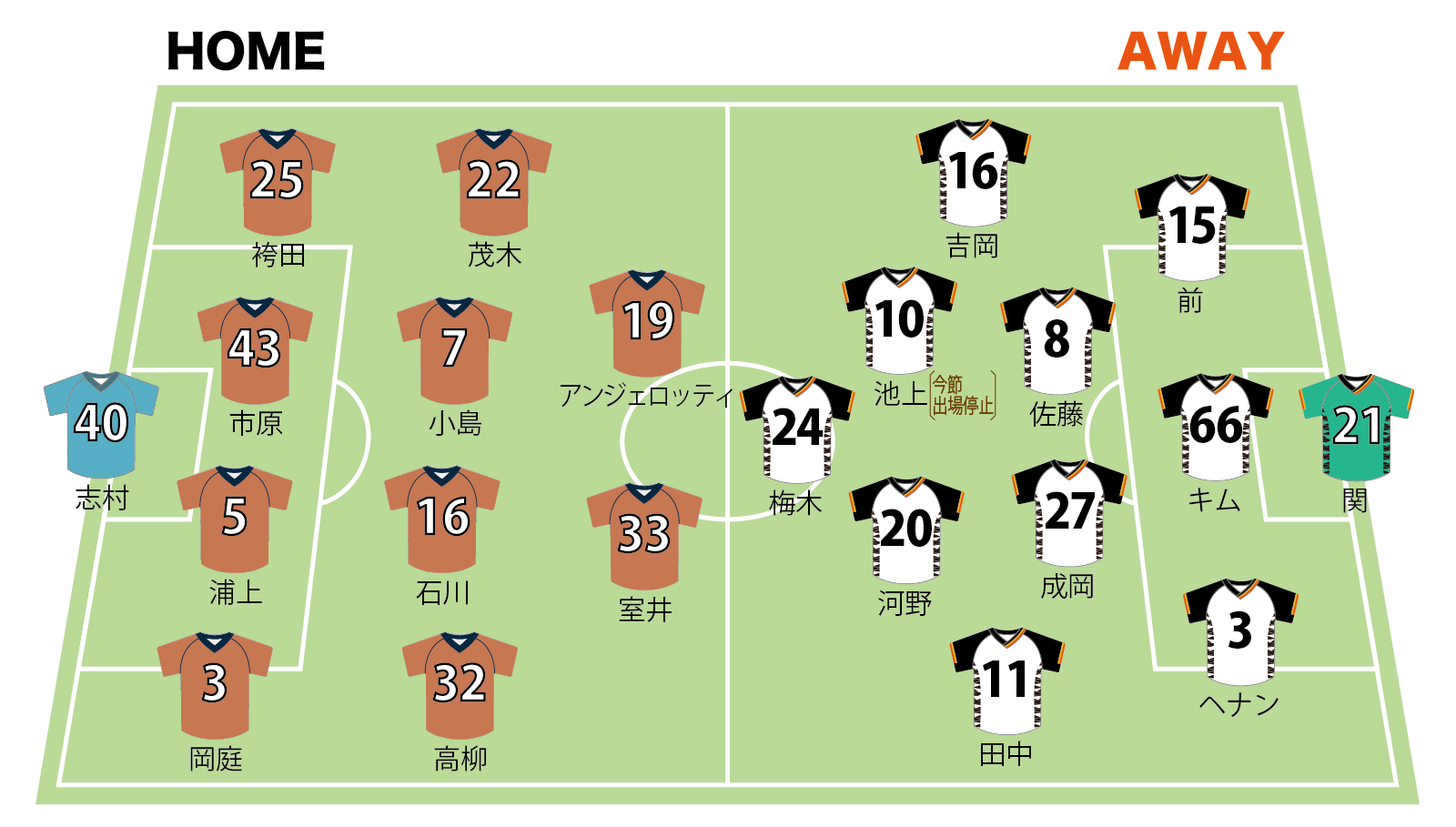 さて今節から図で示すフォーメーションが「前節のフォーメーション」を表示するようになった。実際に両チームともフォーメーションには大幅な変更はないとみられるが、レノファは10.池上丈二が累積警告で出場停止のため、このポジションでの入れ替えは必須。