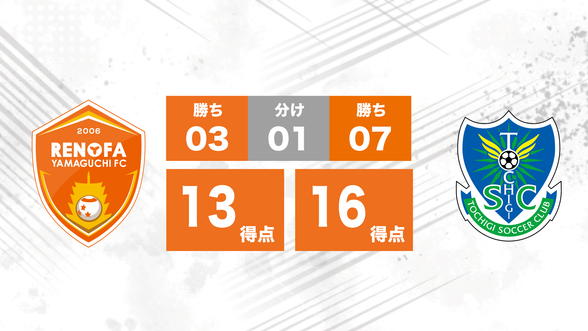 レノファから見た栃木との通算対戦成績は3勝1分7敗。