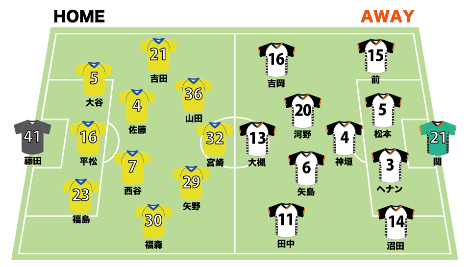 前回は4月8日のみらスタでのゲームで、福島隼斗(背番号23)に先制されたものの、後半アディショナルタイムに24.梅木翼が同点ゴールを決め、1-1で引き分けた。梅木のゴールは右のコーナキックが起点で、10.池上丈二が入れたボールに14.沼田圭悟が飛びついてゴール前に供給。これを18.高木大輔がファーサイドにはたき、梅木が押し込んだ。
