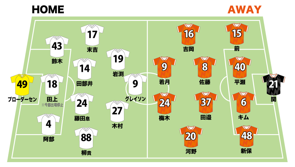 末吉や岩渕に対しては3月9日が誕生日の16.吉岡雅和、複数ポジションをこなしている15.前貴之などが対峙し、逆サイドでは48.新保海鈴が向かい合うが、フォーメーション上はミスマッチが起きやすい。相手を困らせるには縦横に連動して動かなければならず、フィールドプレーヤーのクレバーな振る舞いがカギを握る。