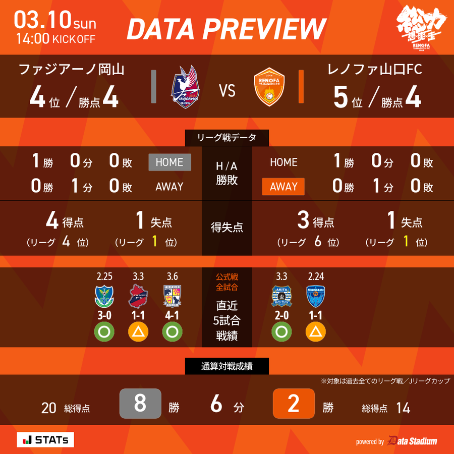 開幕からの2試合を終えて1勝1分で、勝点をしっかりと積み上げているレノファ山口FC。開幕戦が個の力のある横浜FC、第2節がフィジカルが強くダイレクトにボールを送り込んでくるブラウブリッツ秋田だったが、今節のファジアーノ岡山戦のほうが過去2戦に比べると、難しい試合になるかもしれない。
