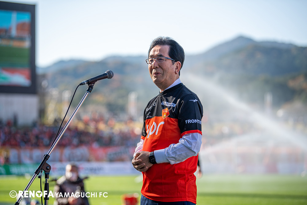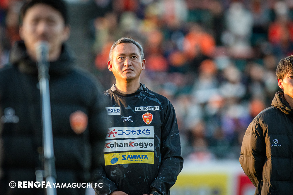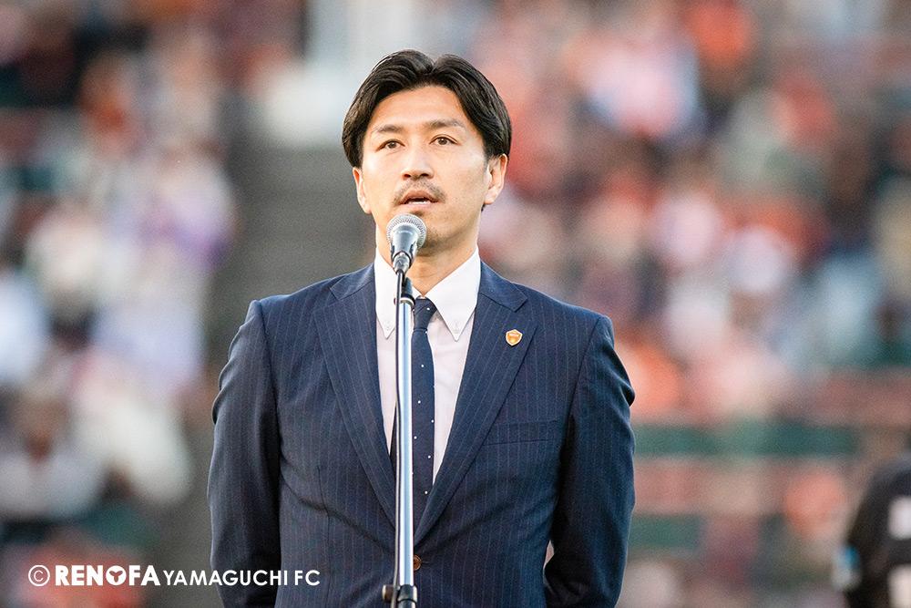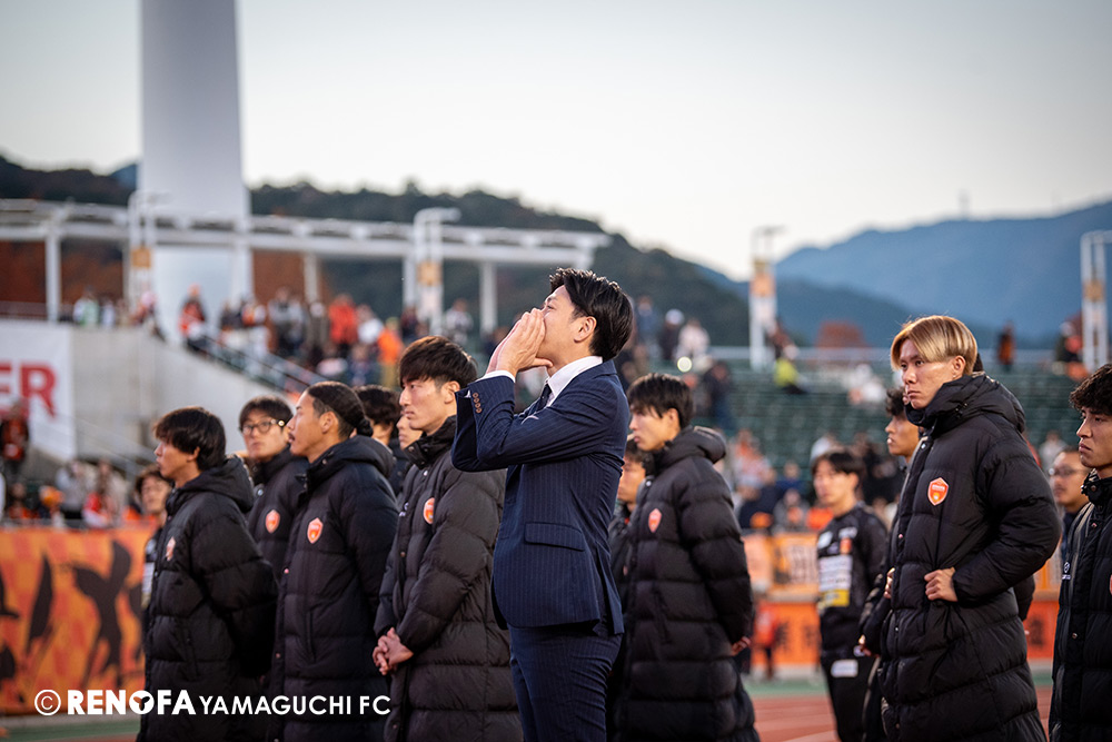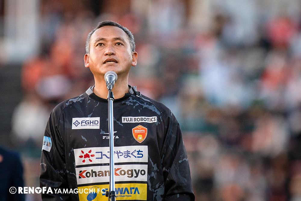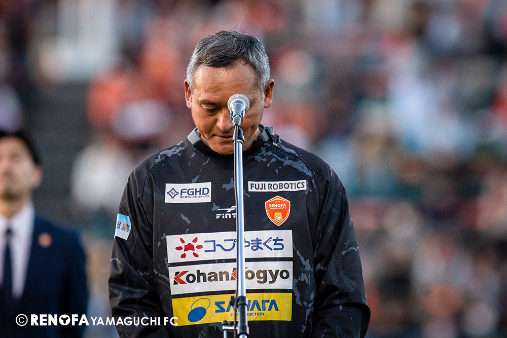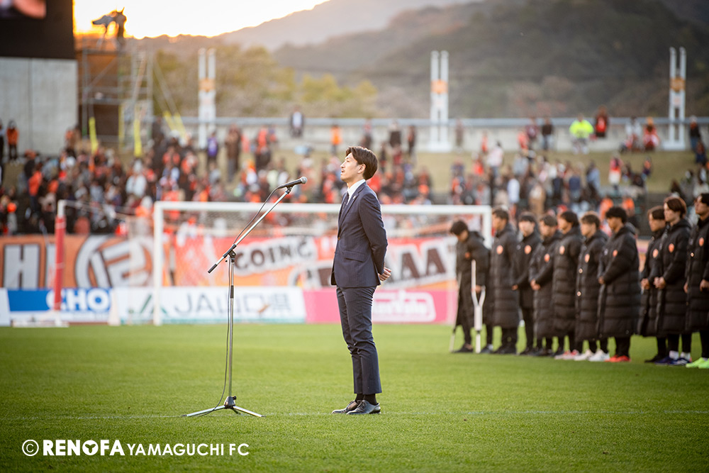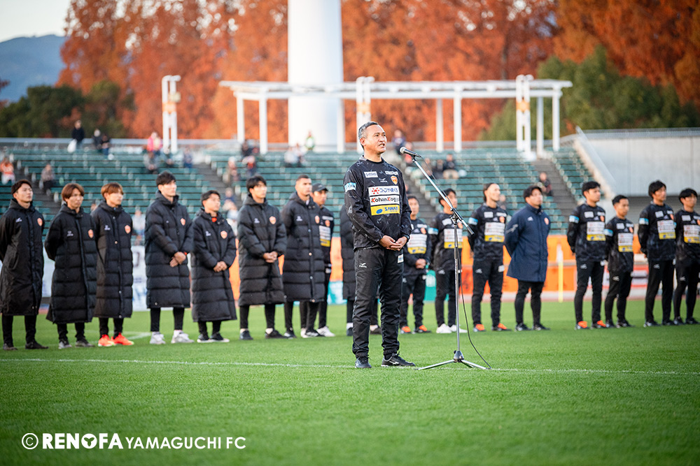 山口国体(2011年)のときに宮成さん(故 宮成隆元GM)が「一緒に山口で戦ってくれないか」と言ってくれたところからスタートして、本当にたくさんの方々に関わっていただきました。プロサッカーチームが地元にあることを目標に帰ってきて、実現できて、最終戦にもこうしてたくさんのサポーターが来ていただいた姿を、宮成さんと一緒に見ることができたら最高だったと思います。ただ、こういうこと(降格)もプロスポーツの世界ですので、今日来てくれたサポーターがいろいろな思いを感じてくれたと思います。その思いがプロサッカーチームのある意義だと思いますので、このレノファが夢、感動、元気を本当に届け続けられる存在であるようまた前進していければと思います。