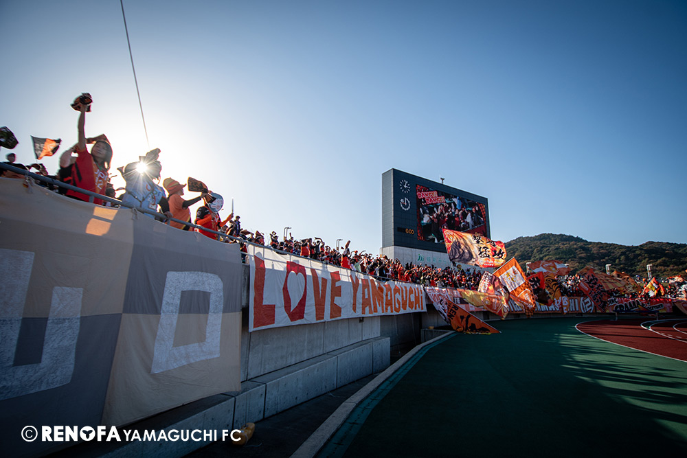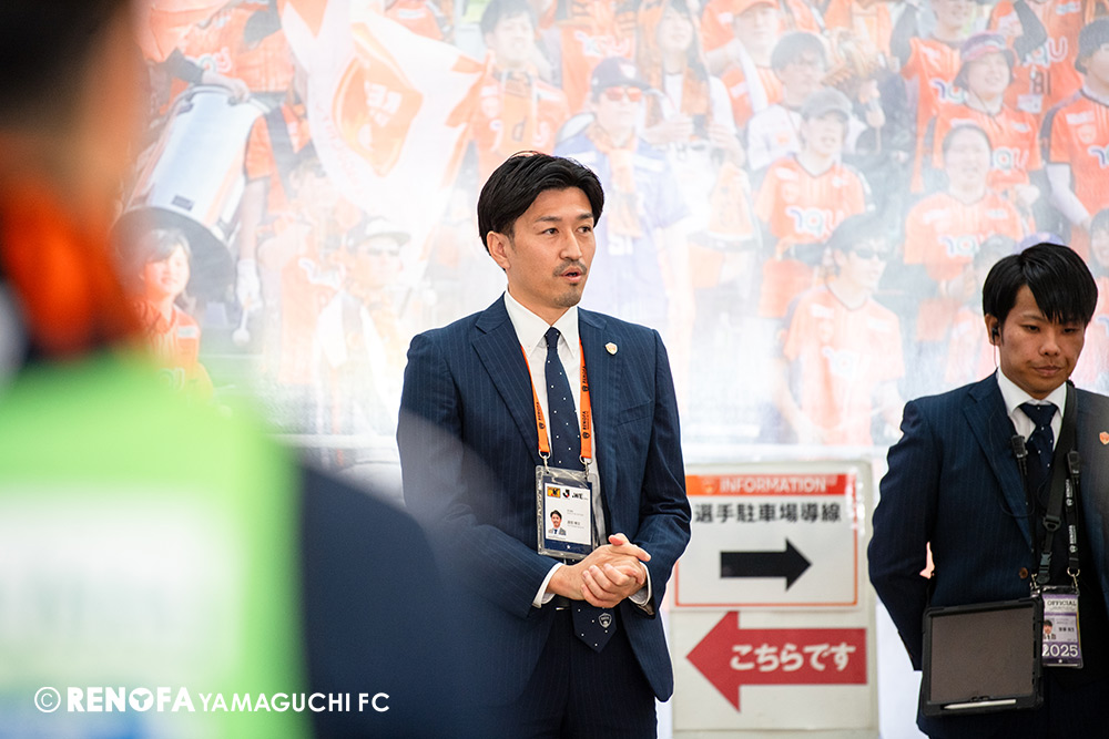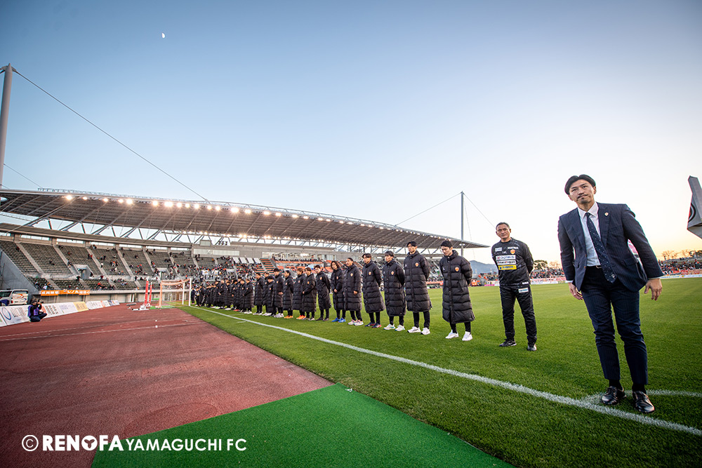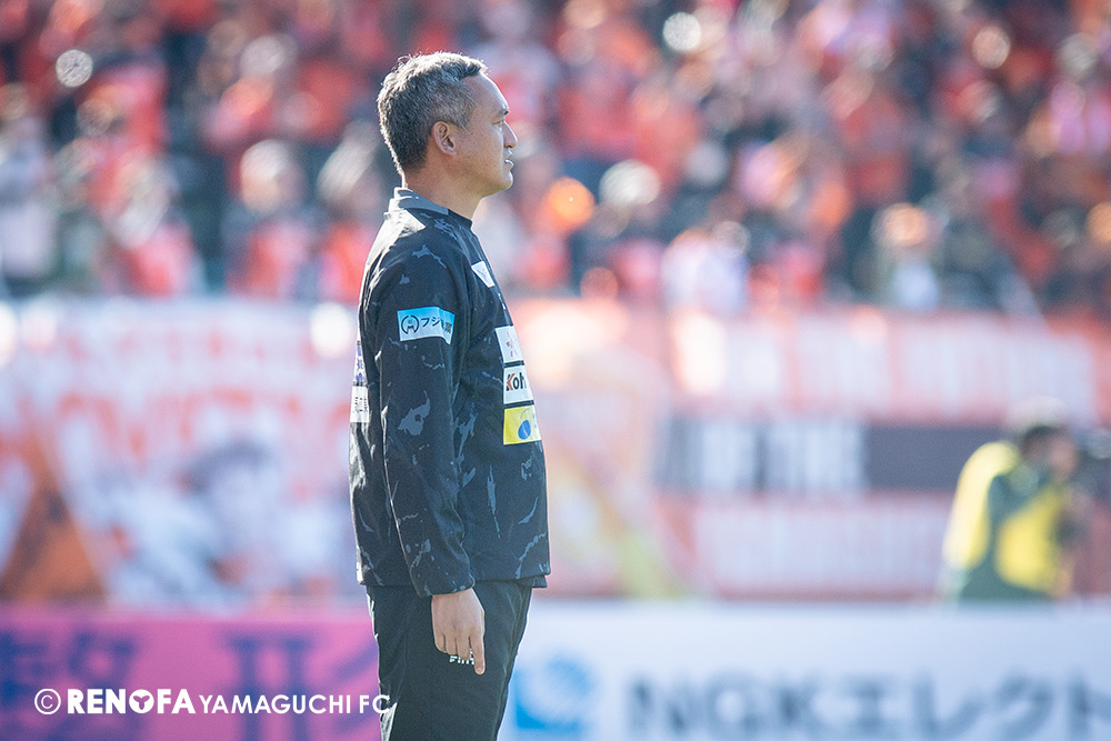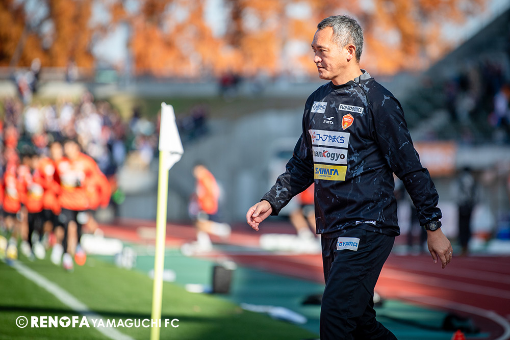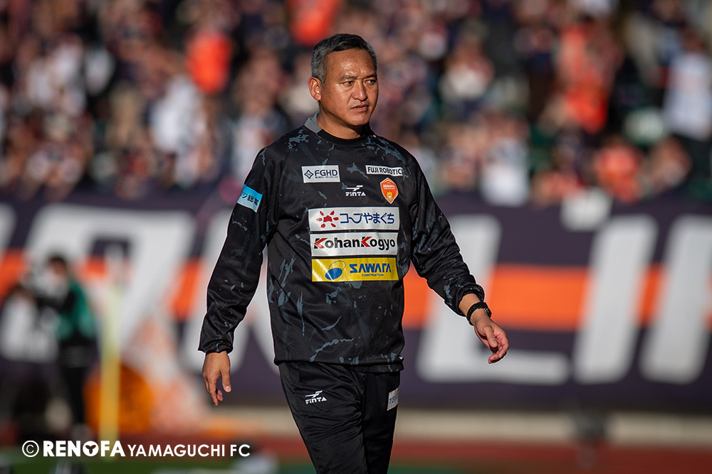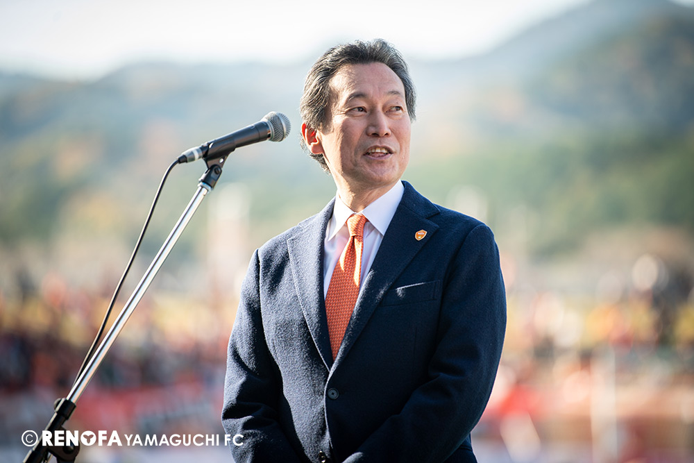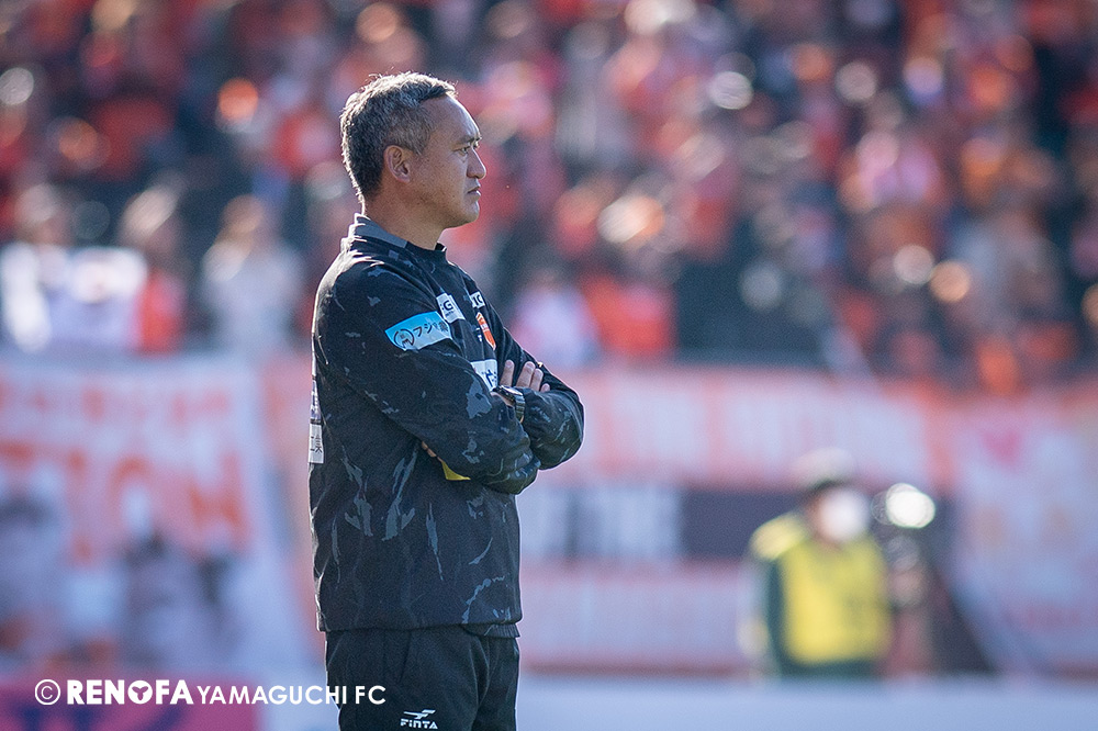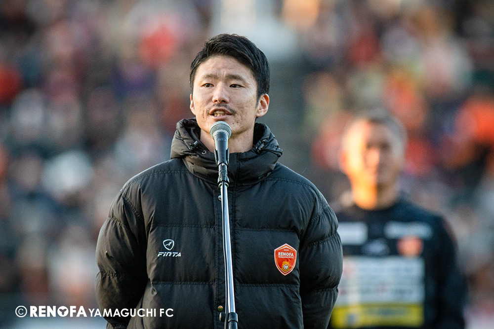 山口国体(2011年)のときに宮成さん(故 宮成隆元GM)が「一緒に山口で戦ってくれないか」と言ってくれたところからスタートして、本当にたくさんの方々に関わっていただきました。プロサッカーチームが地元にあることを目標に帰ってきて、実現できて、最終戦にもこうしてたくさんのサポーターが来ていただいた姿を、宮成さんと一緒に見ることができたら最高だったと思います。ただ、こういうこと(降格)もプロスポーツの世界ですので、今日来てくれたサポーターがいろいろな思いを感じてくれたと思います。その思いがプロサッカーチームのある意義だと思いますので、このレノファが夢、感動、元気を本当に届け続けられる存在であるようまた前進していければと思います。