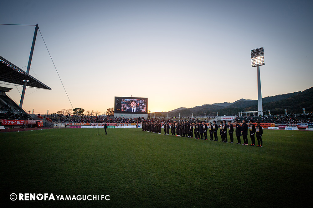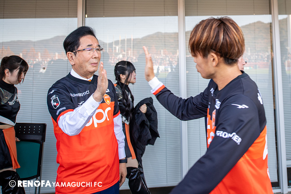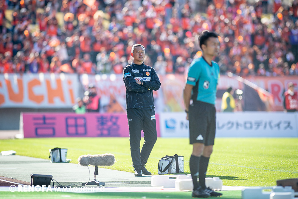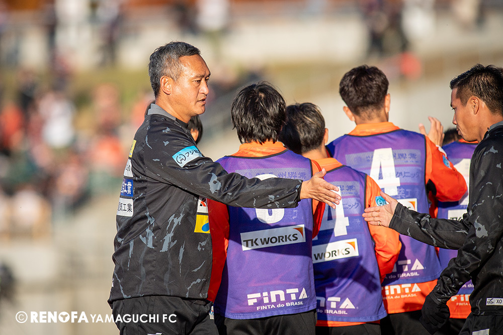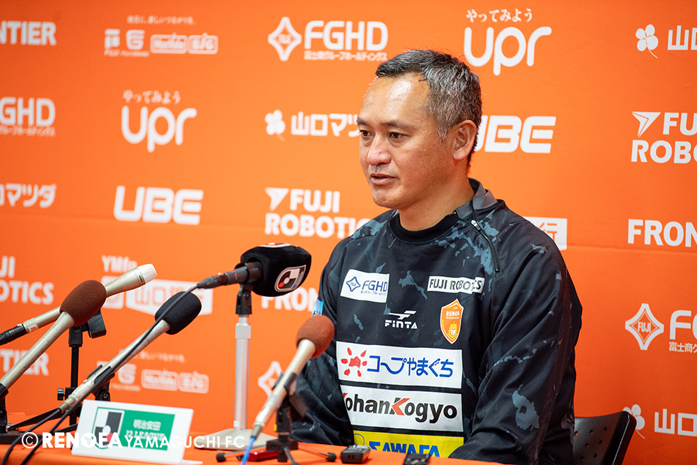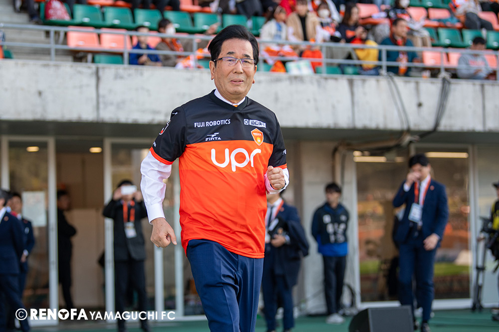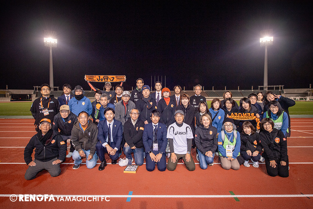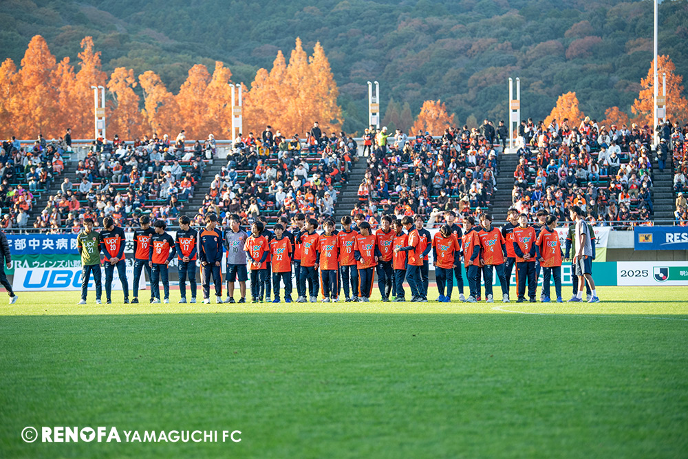 山口国体(2011年)のときに宮成さん(故 宮成隆元GM)が「一緒に山口で戦ってくれないか」と言ってくれたところからスタートして、本当にたくさんの方々に関わっていただきました。プロサッカーチームが地元にあることを目標に帰ってきて、実現できて、最終戦にもこうしてたくさんのサポーターが来ていただいた姿を、宮成さんと一緒に見ることができたら最高だったと思います。ただ、こういうこと(降格)もプロスポーツの世界ですので、今日来てくれたサポーターがいろいろな思いを感じてくれたと思います。その思いがプロサッカーチームのある意義だと思いますので、このレノファが夢、感動、元気を本当に届け続けられる存在であるようまた前進していければと思います。