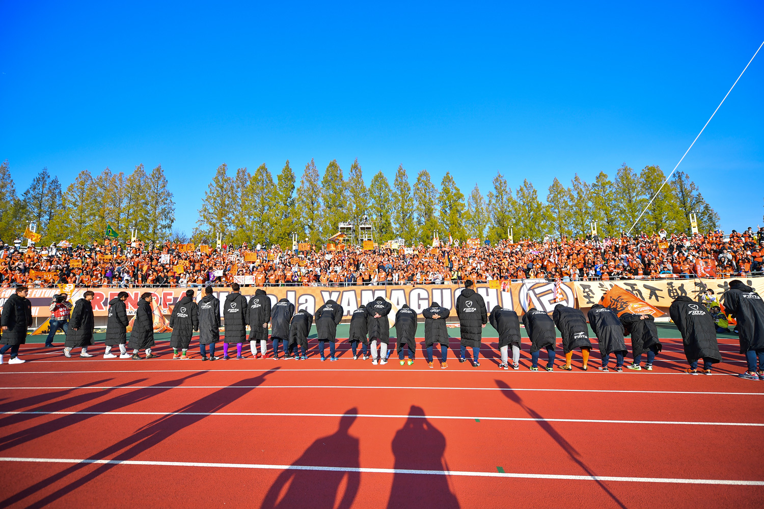 最終戦の翌日には霜田正浩監督の続投が報じられました。12月1日にファン・サポーターが選手たちと楽しい時間を共有したファン感謝祭そしてシーズン報告会を終えレノファ山口の2019シーズン全日程が終了。その後順次、2019シーズンを戦った多くの中心選手たちの移籍や退団が発表されました。2020年シーズンJ2のチーム構成として松本山雅とジュビロ磐田がJ1から降格、J2全22チーム中12チームがJ1経験チームであり年々厳しいリーグになってきていますが、臆することなくひるむことなくレノファ山口の挑戦は続きます。
