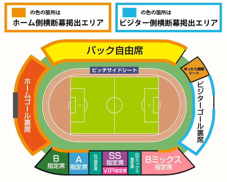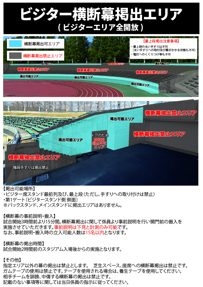 ビジター席スタンド最前列及び、最上段(ただし、手すりへの取り付けは禁止)