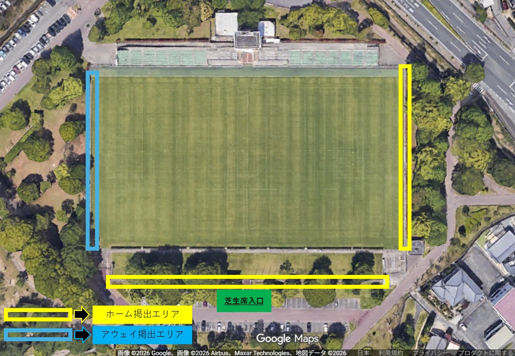 声出し・鳴物応援エリアは下記画像内の各応援席でお願いいたします。