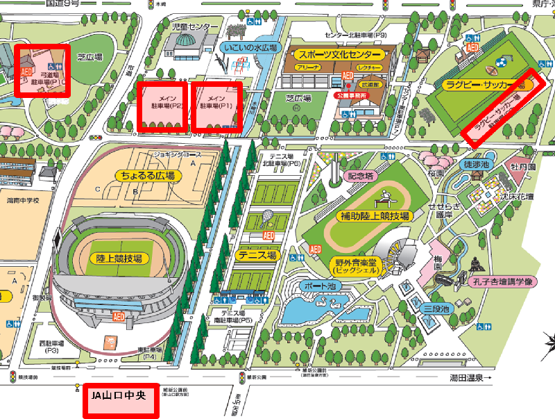 ☆P1駐車場、P2駐車場、弓道場駐車場(P10)、ラグビー・サッカー場駐車場(P8)、JA山口中央駐車場